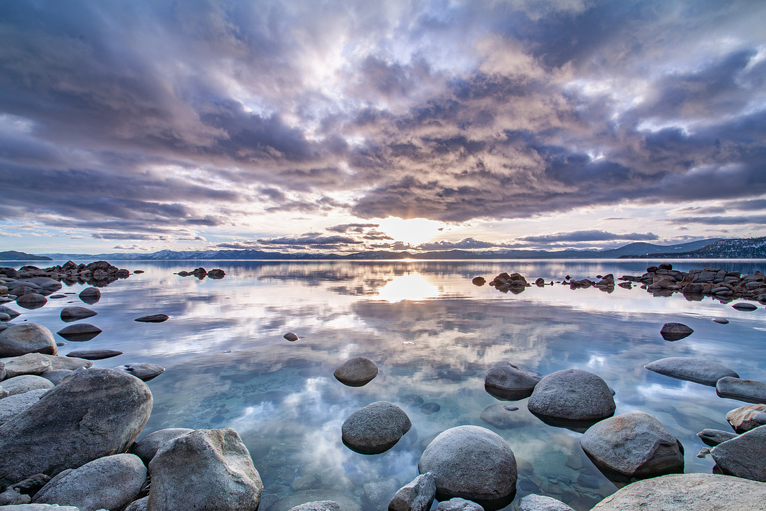 Sunsets appear colorful because of how sunlight interacts with Earth’s atmosphere. As the sun lowers, its light travels through more air, scattering shorter wavelengths like blue and violet. On most days, these colors scatter out of view, leaving reds and oranges behind. But when the air is especially clear or contains fine particles like water vapor, those cooler tones can remain visible. That’s why some sunsets—like this one over Lake Tahoe—show deep blues and purples instead of the usual warm hues.